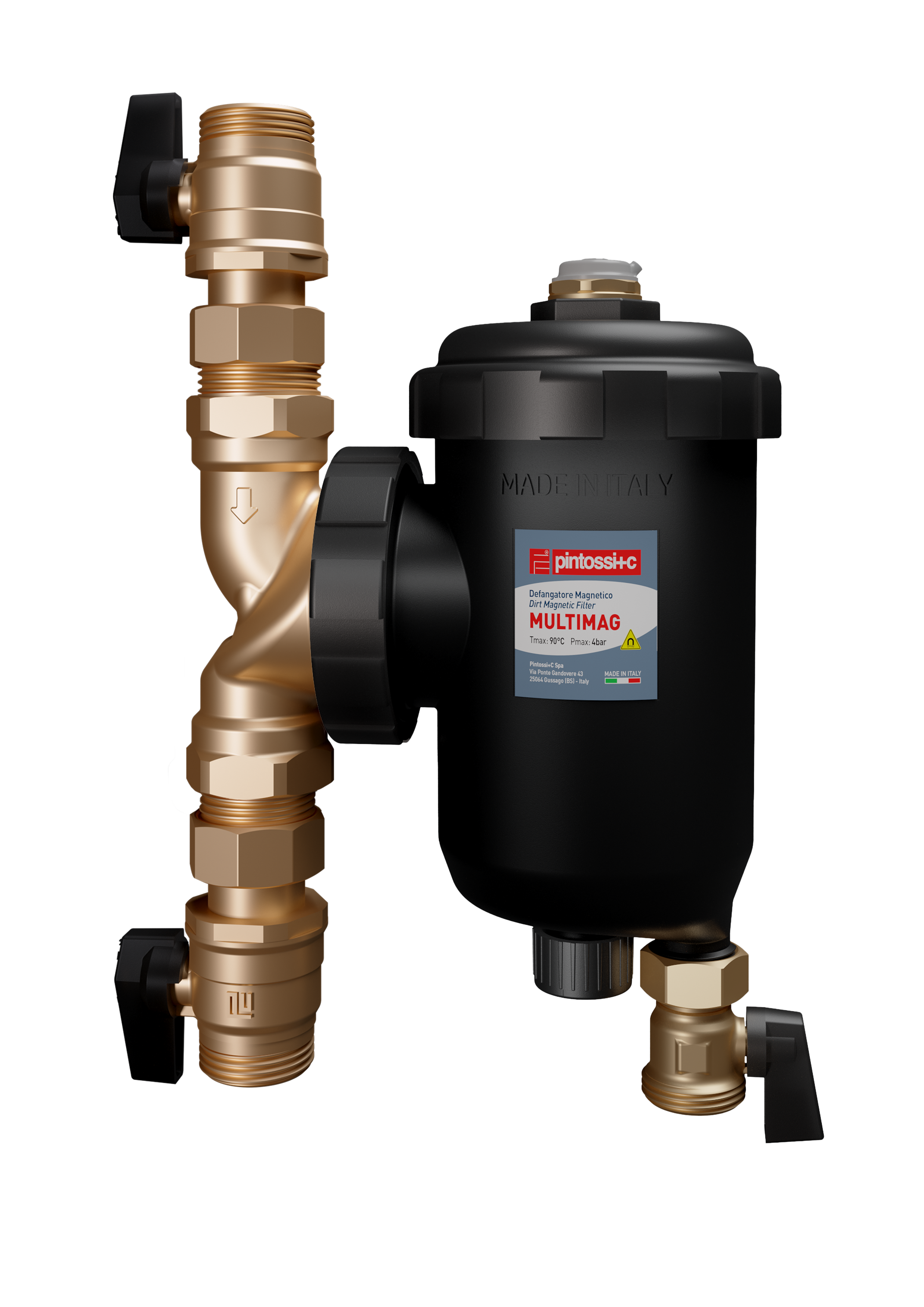 MULTIMAG Magnetic Dirt Separator with brass swivel connections and male fittings. Equipped with impurity drain valve and manual air vent.